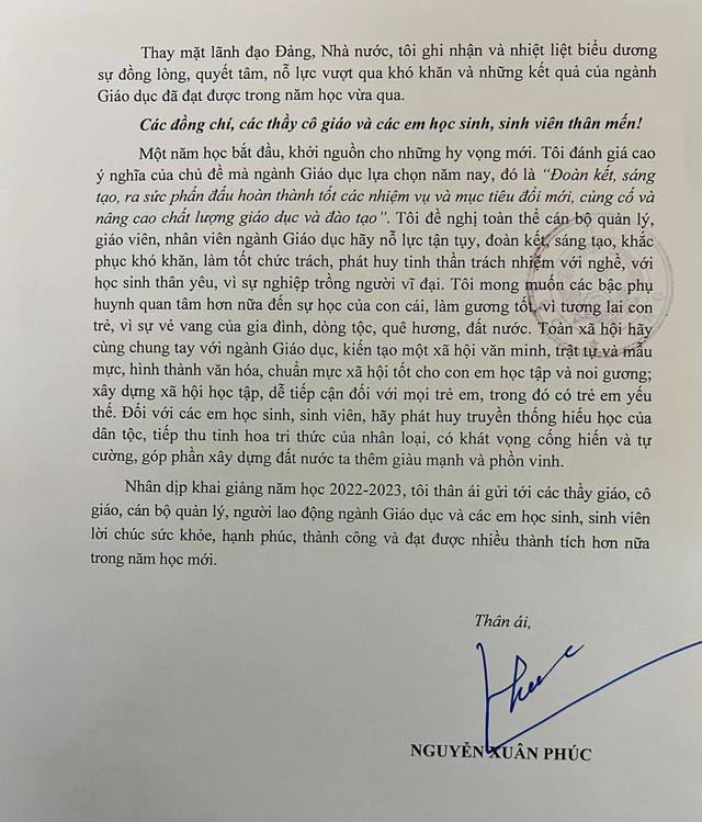 Nhân dịp khai giảng năm học 2022-2023, tôi thân ái gửi tới các thầy giáo, cô giáo, cán bộ quản lý, người lao động ngành Giáo dục và các em học sinh, sinh viên lời chúc sức khỏe, hạnh phúc, thành công và đạt được nhiều thành tích hơn nữa trong năm học mới.