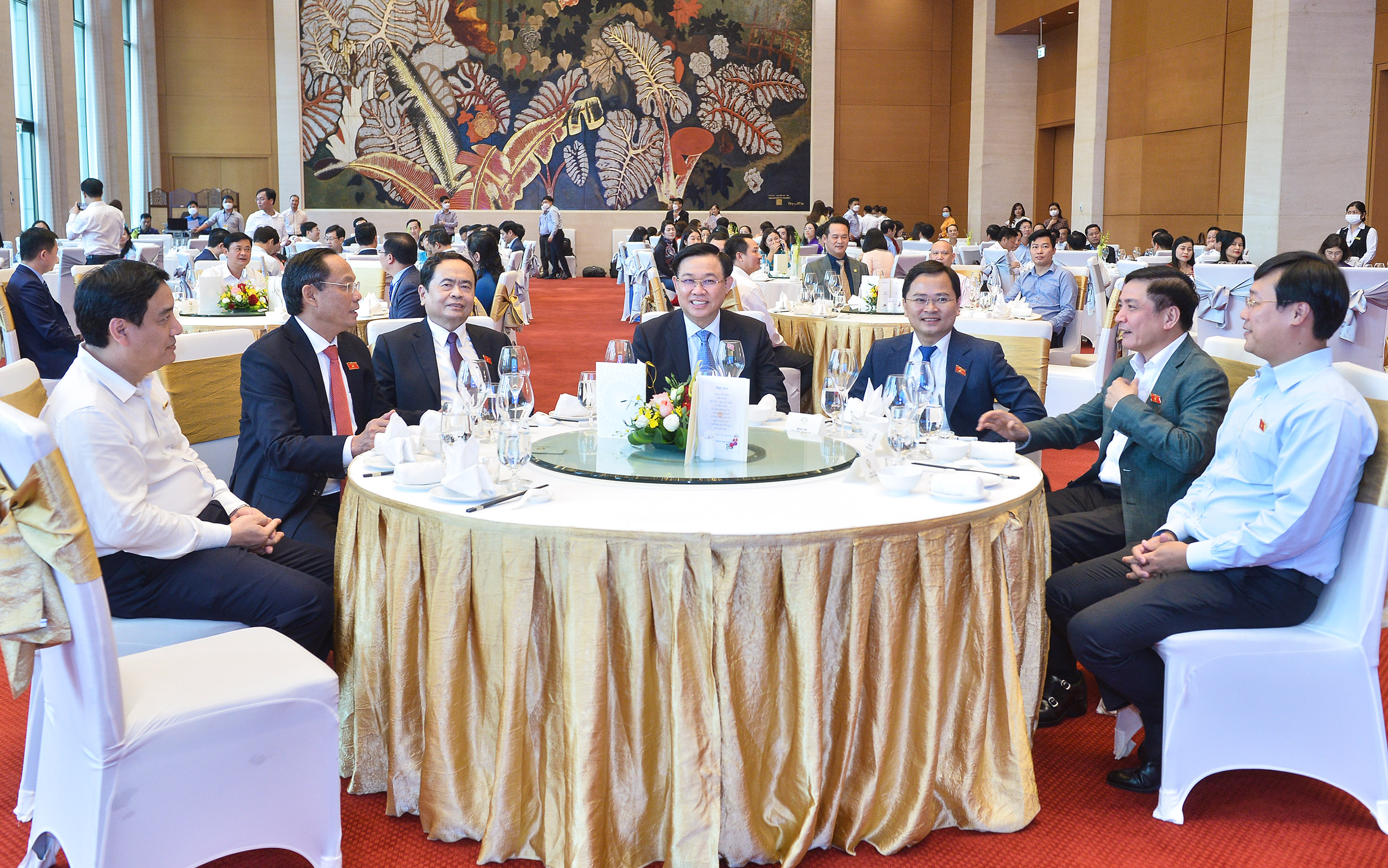 Chủ tịch Quốc hội Vương Đình Huệ, Phó Chủ tịch Thường trực Quốc hội Trần Thanh Mẫn và Phó Chủ tịch Quốc hội Trần Quang Phương cùng các đại biểu tại cuộc gặp mặt