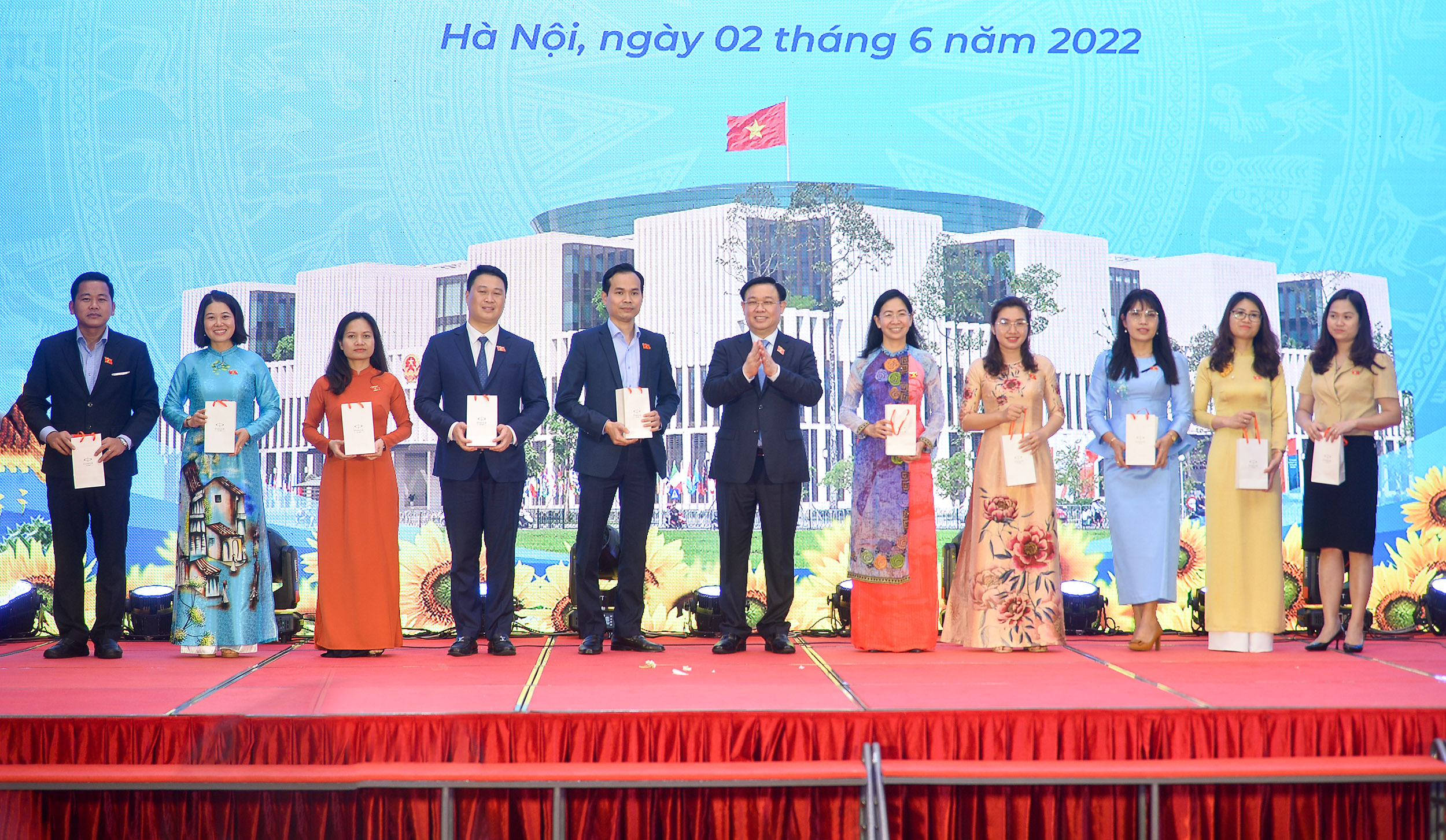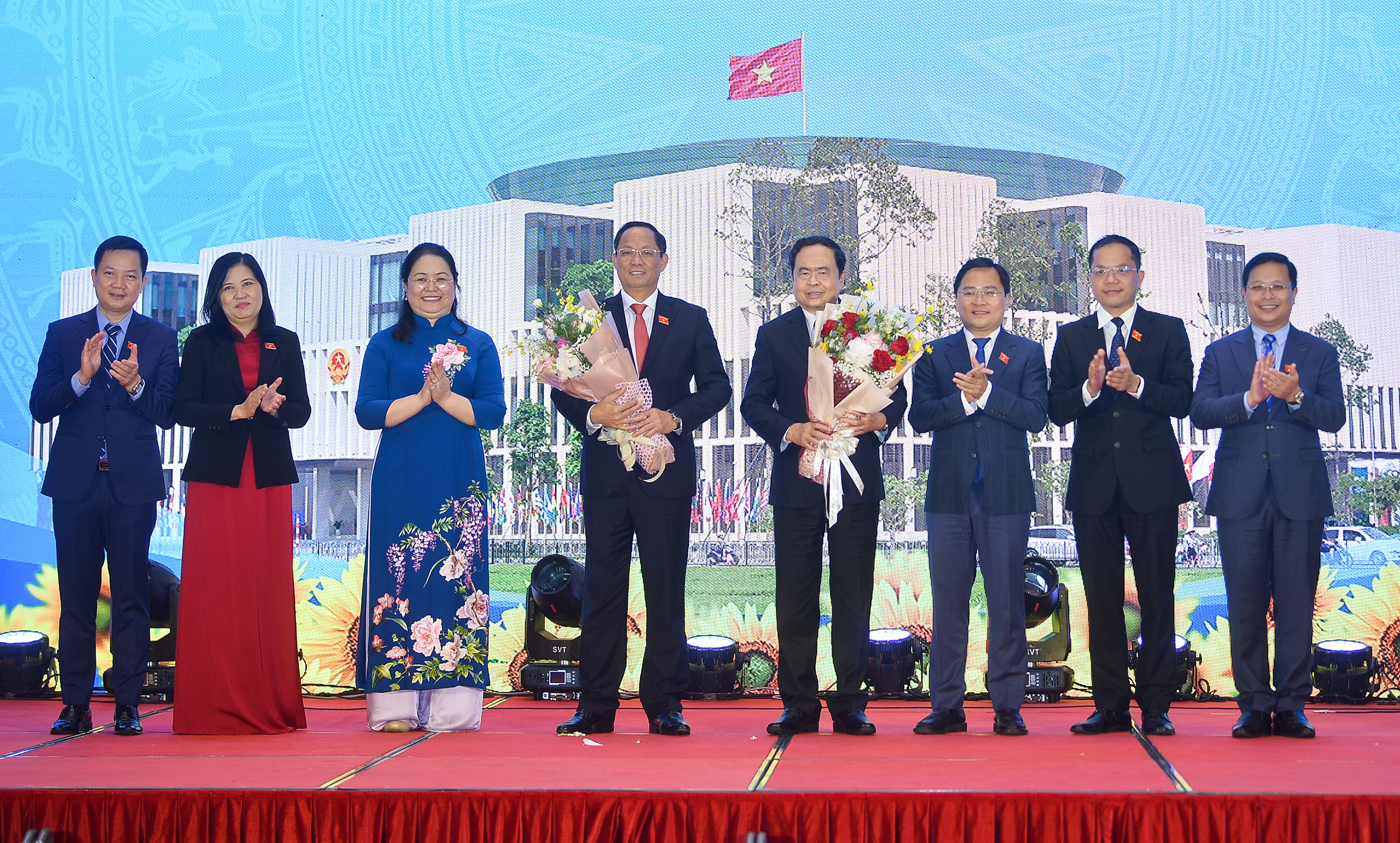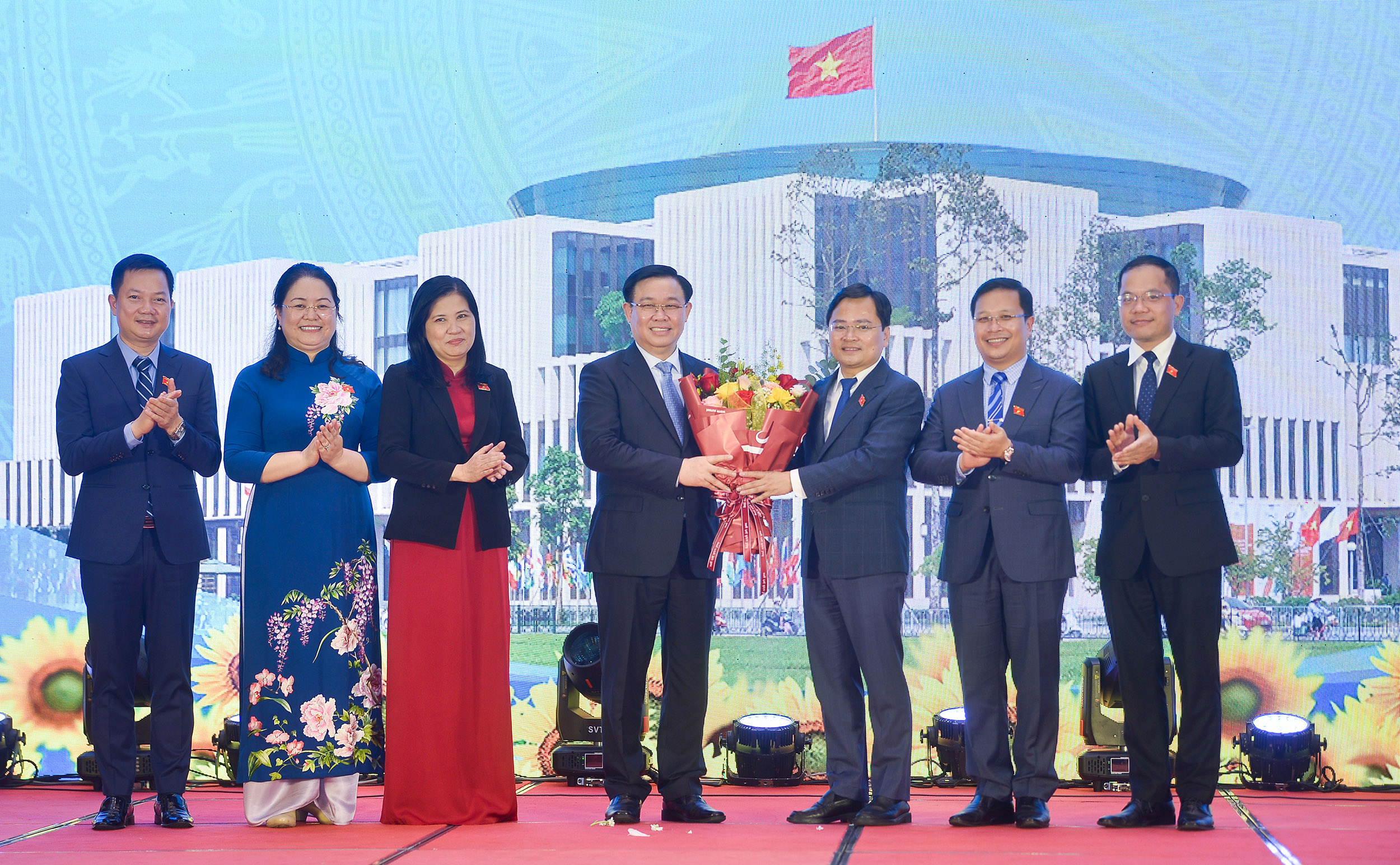 Các thành viên Nhóm đại biểu Quốc hội trẻ khóa XV tặng hoa Chủ tịch Quốc hội Vương Đình Huệ, Phó Chủ tịch Thường trực Quốc hội Trần Thanh Mẫn và Phó Chủ tịch Quốc hội Trần Quang Phương