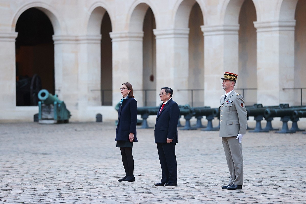 Trong không khí trang nghiêm, khi Thủ tướng Phạm Minh Chính và Đoàn đại biểu cấp cao Việt Nam tiến vào sân chính của Điện Invalides, quân nhạc cử quốc thiều hai nước. Sau đó, Bộ trưởng Amelie de Montchallin mời Thủ tướng Chính phủ Phạm Minh Chính duyệt Đội Danh dự. Sau khi Đội Danh dự diễu hành để Thủ tướng Phạm Minh Chính duyệt, Đội trưởng Đội quân nhạc tiến đến chào Thủ tướng Chính phủ Phạm Minh Chính.