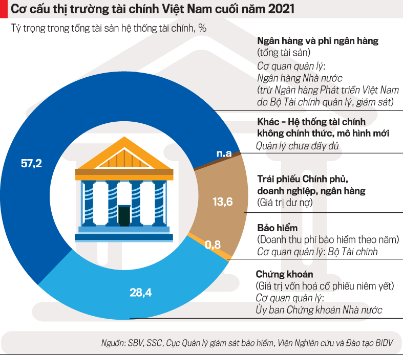 Hiện tại, thị trường tài chính Việt Nam đã phát triển tương đối đầy đủ, với 3 khu vực chính là ngân hàng, chứng khoán và bảo hiểm. Quy mô tính theo thông lệ đến cuối năm 2021 tương đương khoảng 300% GDP. Trong đó, hệ thống ngân hàng giữ vai trò chủ đạo, chiếm khoảng 57,2%; thị trường cổ phiếu chiếm 28,4%; dư nợ thị trường trái phiếu và doanh thu phí bảo hiểm chiếm lần lượt 13,6% và 0,8% quy mô hệ thống tài chính Việt Nam.